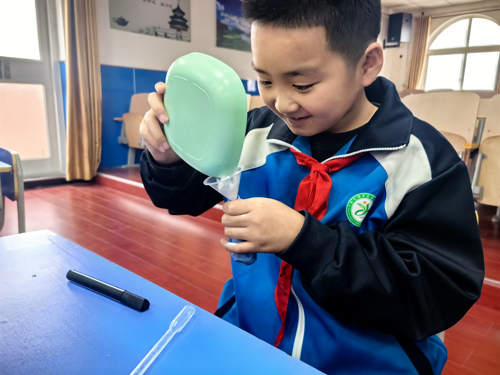 随后进行的“生气的河豚”实验将活动推向高潮——孩子们亲眼见证白醋与小苏打混合后产生二氧化碳,让气球迅速鼓起的奇妙现象。教室里惊叹声此起彼伏,抽象的“气体占据空间”原理在趣味实验中变得直观可感。