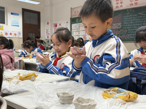 动手环节更是将气氛推向高潮!同学们在老师的指导下,拿起柔软的泥土,尽情发挥想象力与创造力。揉、捏、搓、压,一系列动作下来,稚嫩的手掌间,泥土逐渐“活”了起来——憨态可掬的小兔子、创意十足的卡通人物、古朴别致的小杯子……一件件充满童趣的泥塑作品悄然诞生。指尖流转的不仅是泥土,更是专注与创造的喜悦,同学们在揉捏塑造中,深刻领略了传统手工艺的独特魅力。