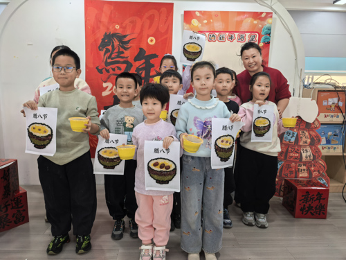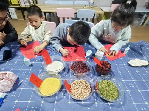 动手环节中,孩子在指导下用五谷杂粮制作腊八主题画作,可带回家珍藏;同时参与腊八蒜腌制,工作人员讲解方法及吉祥寓意,孩子全程动手操作,成品可春节开封品尝。
